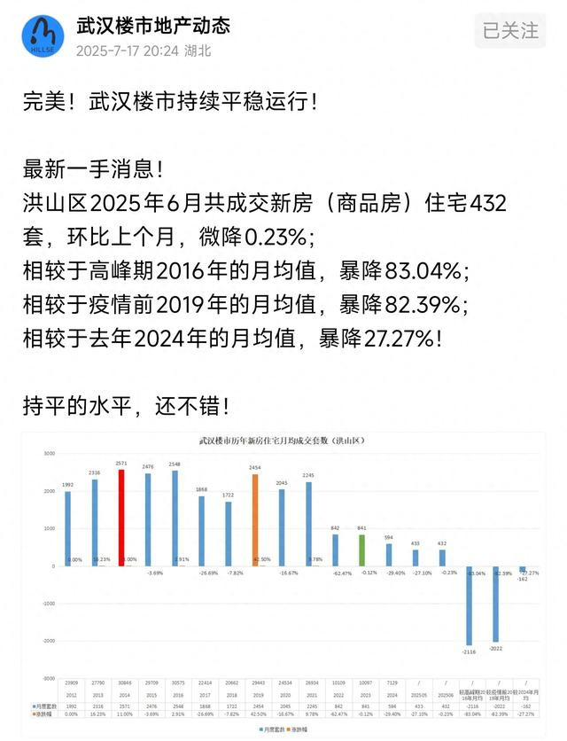 楼市新机遇,武汉楼市全面回暖,洪山区新房成交432套,环比下跌0.23%,释放了什么信号?