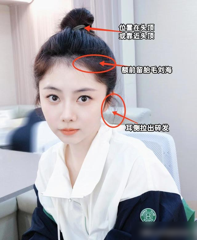 高丸子头青春减龄,发量少靠堆量显蓬松,碎发修饰发际线。