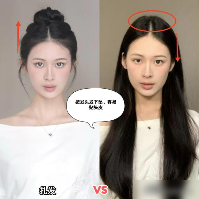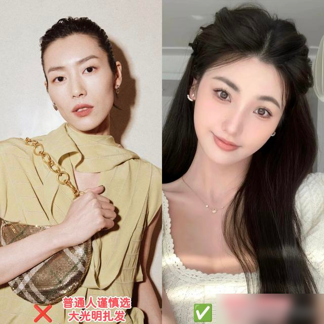 扎发最妙的是能“救脸”,圆脸扎高马尾或丸子头,头发堆头顶拉长脸型,肉脸秒变小V脸。方脸选侧分低马尾或低髻,柔化下颌线条,气质温婉又古典。菱形脸颧骨突出?半扎发加蓬松刘海一遮,凶相变柔美。颅顶低的姐妹也别怕,扎发时扯松头顶发根,用抓夹垫高,轻松造出“头包脸”效果,脑袋圆润不贴头皮。